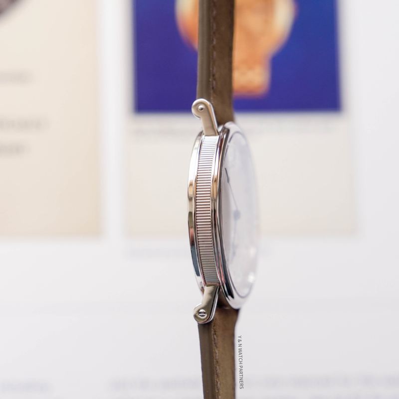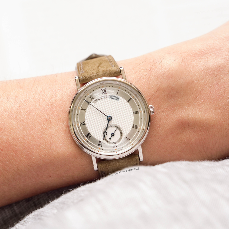當你翻開寶玑最新的產品錄,你會發現現行款Classique經典系列中幾乎很難再見到36mm以下的型號。在大部分小於36mm的Classique經典系列腕表都已換代並尺寸變大的2010年代,有一個生產了多年的經典型號還在做著“最後的抵抗”,這便是我們今天的主角Breguet Classique ref.5907。小三針錶盤的設計其實是非常考驗機芯和錶盤的比例的,中心針軸和小錶盤的距離就直接決定了這塊錶的美感,所以34mm 是一個幾乎完美的尺寸,他個後繼者錶盤做得太大,讓整錶失去了精緻感。