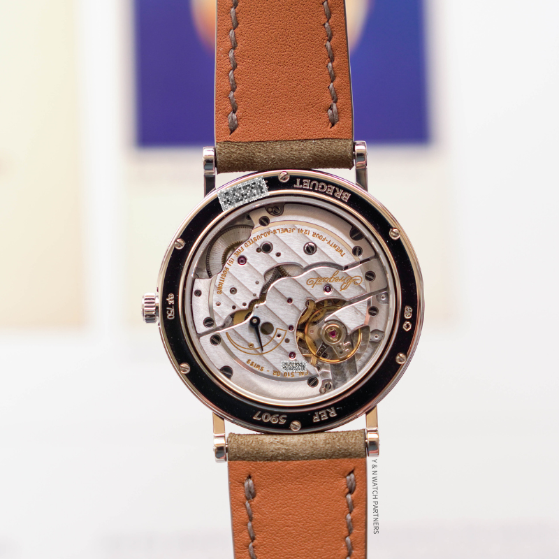 Ref.5907於2010年推出,幾乎保留了Breguet所有的經典元素,錢幣紋,Breguet指針,Guilloché錶盤… 錶盤工藝非常複雜,錶盤外圈,時標,刻度圈和銘牌採用了環形拉絲工藝製作,錶盤中間區域採用Guilloché, 而且大小錶盤的Guilloché紋理都有所不同,錶盤層次高低錯落有致,增加了整個錶盤的立體感,12顆小巧的黃金刻度是整個錶盤的點睛之筆,加工如此多的細節,對制錶師來講絕不是一件容易的事情,也對得起錶盤6點鐘下方“SWISS GUILLOCHE MAIN”之名,12點位有Breguet大師簽名,據說當年大師是為了防偽,而這一傳統也被品牌保留下來,被後人津津樂道。
