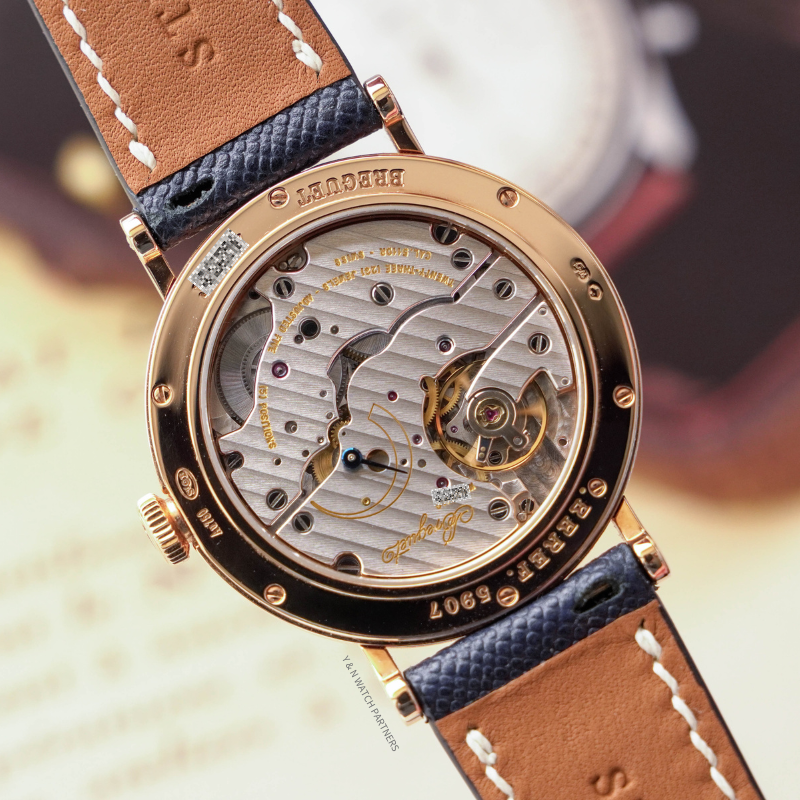 Ref.5907於2010年推出,幾乎保留了Breguet所有的經典元素,錢幣紋,Breguet指針,Guilloché錶盤… 錶盤工藝非常複雜,錶盤外圈,時標,刻度圈和銘牌採用了環形拉絲工藝製作,錶盤中間區域採用Guilloché, 而且大小錶盤的Guilloché紋理都有所不同,錶盤層次高低錯落有致,增加了整個錶盤的立體感,12顆小巧的黃金刻度是整個錶盤的點睛之筆,加工如此多的細節,對制錶師來講絕不是一件容易的事情,也對得起錶盤6點鐘下方“SWISS GUILLOCHE MAIN”之名,12點位有Breguet大師簽名,據說當年大師是為了防偽,而這一傳統也被品牌保留下來,被後人津津樂道。