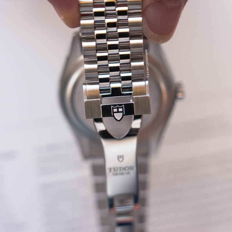 錶盤配備帝舵最具辨識度的雪花指針。這組源自1970年代、最初為法國海軍特製的粗體指針設計,因其在昏暗的水下環境中讀時清晰,從此成為帝舵潛水腕錶代代傳承的經典標誌。另一方面,Ref.79680設計深譜取捨之道:為適配現代都市日常生活,它捨棄了傳統潛水腕錶的旋轉計時圈,改以磨光及磨砂不鏽鋼外圈,讓整體造型更加簡潔俐落;錶帶也捨棄織物錶帶,引入“正裝風”的五珠鏈,為整體腕錶增添了一份從容優雅。面盤選色亦見匠心,相較於帝舵常見的黑面或紅圈款式,Ref.79680的鋼藍更顯寧靜低調,折射出一種冷冽美感。