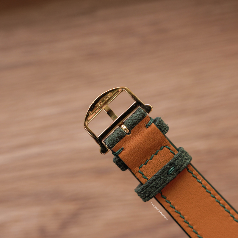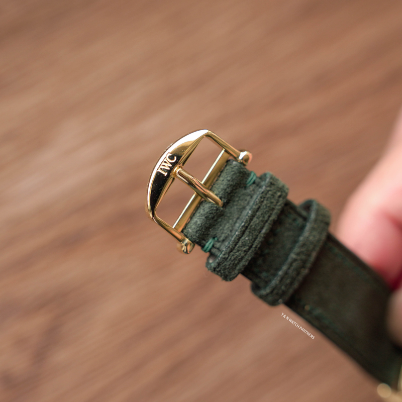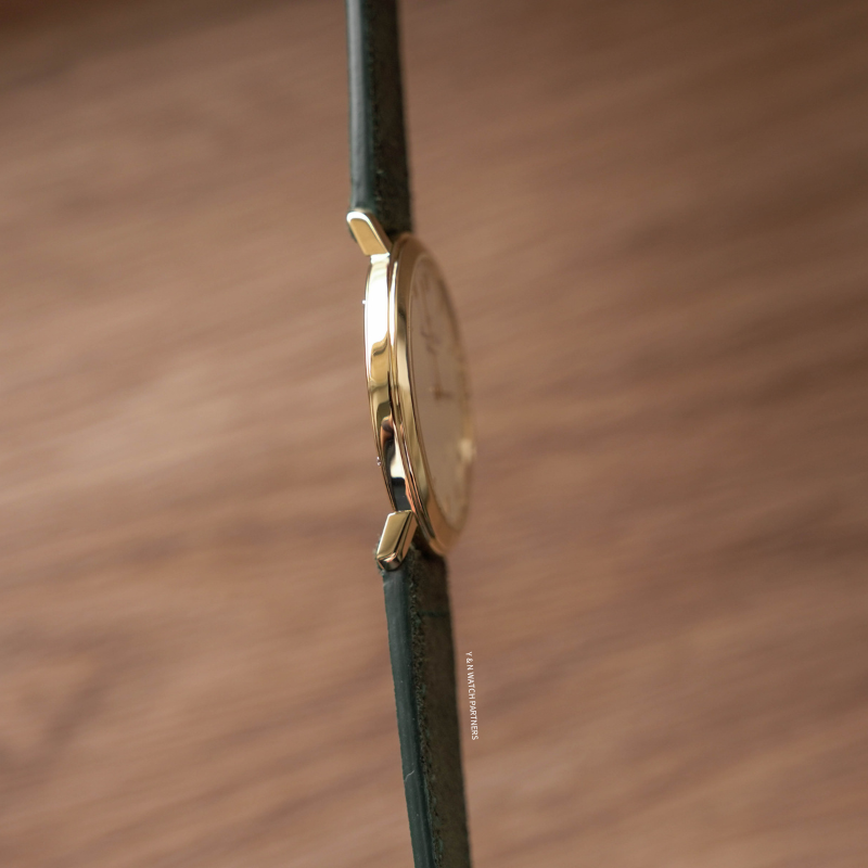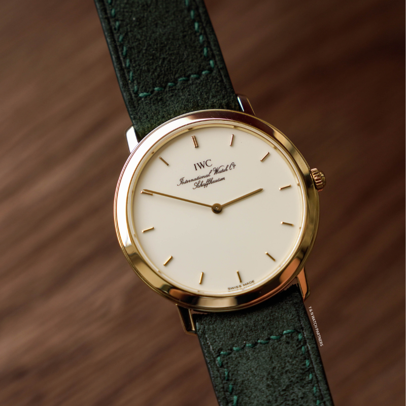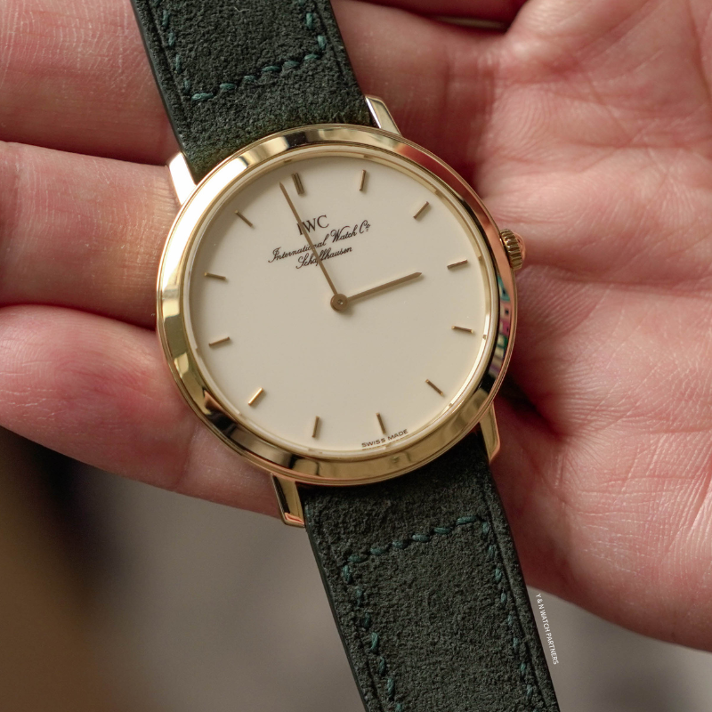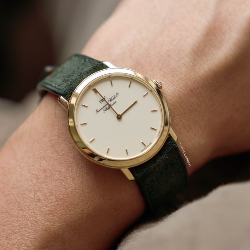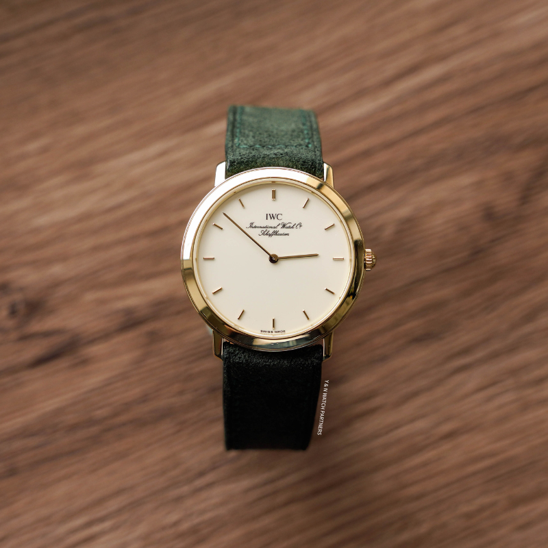 IWC Portofino的風格主打簡潔純粹,整個系列均以less is more為設計信條,面盤幾近素面,只以十二枚金色條形刻度環繞盤緣,品牌署名以幾行筆鋒優雅的花體字悄然落下,兩枚纖細修長的柳葉指針,是表面畫布上唯一的運動軌跡錶殼18k金材質,原廠錶扣,尺寸收斂,輕巧貼腕,佩戴之時幾無負擔。搭載Jaeger-LeCoultre超薄手上鍊機芯,機芯已由 Nicky Sir 完成保養,運作狀態極佳,並享有本工作室一年保養。